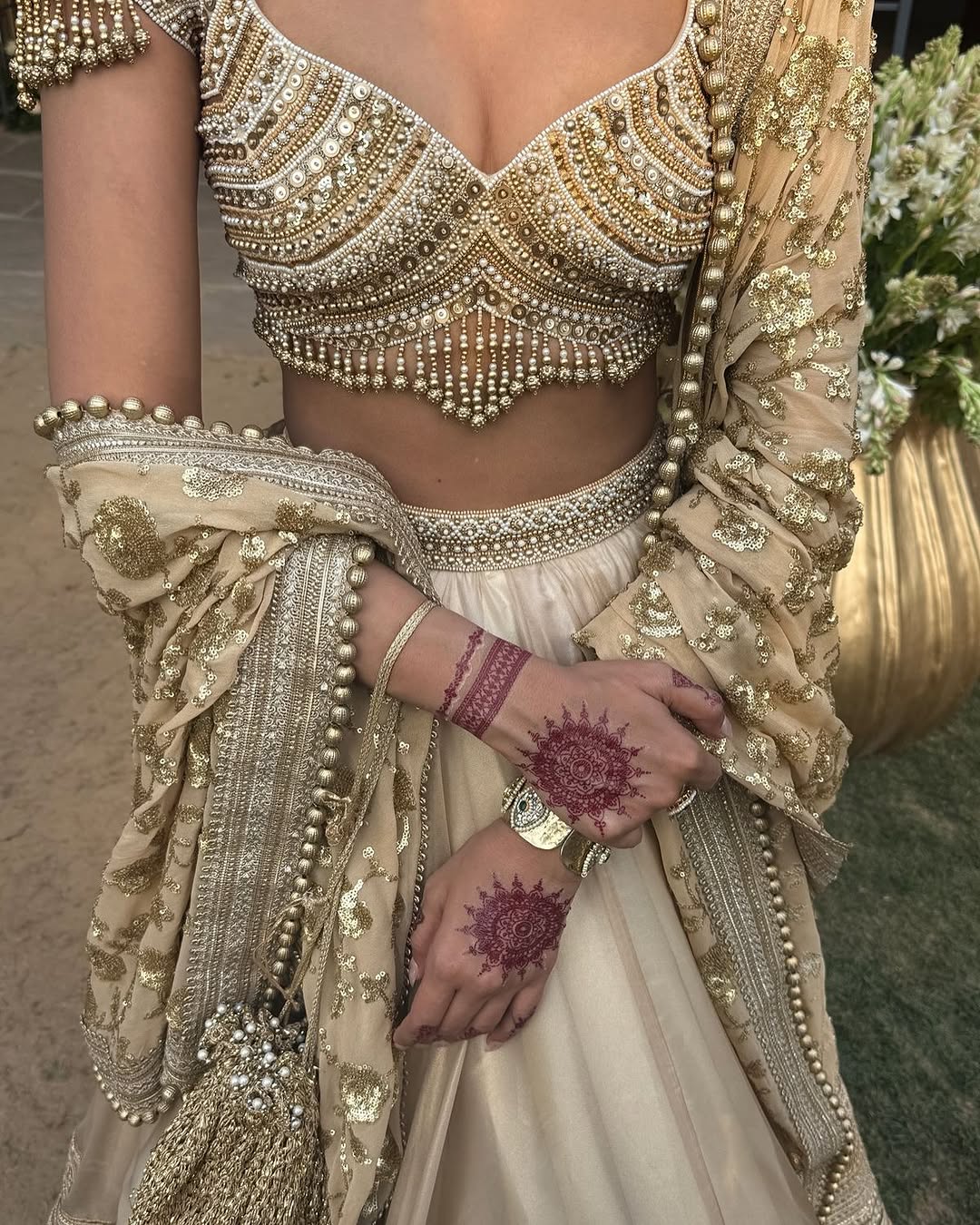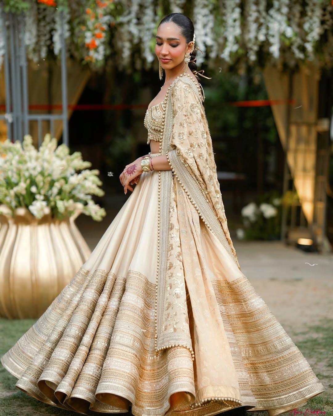 Indulge in the grandeur of this ivory lehenga with exquisite detailing throughout. The lehenga boasts a voluminous flair, complemented by intricate borders at the bottom. The blouse features stunning craftsmanship with detailed work, while the dupatta dazzles with sequins and a bordered edge, adding an extra touch of sparkle and elegance to this luxurious ensemble.