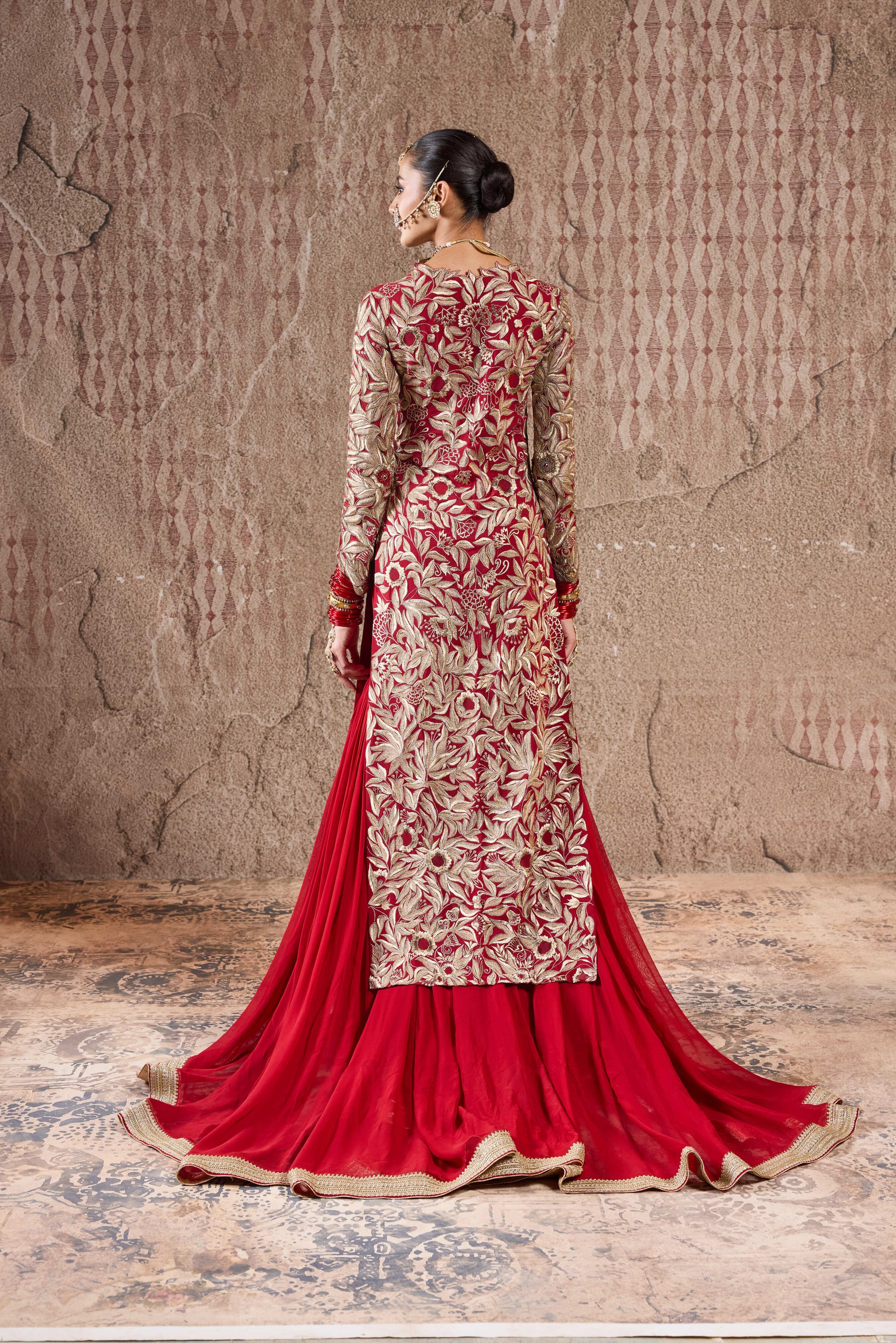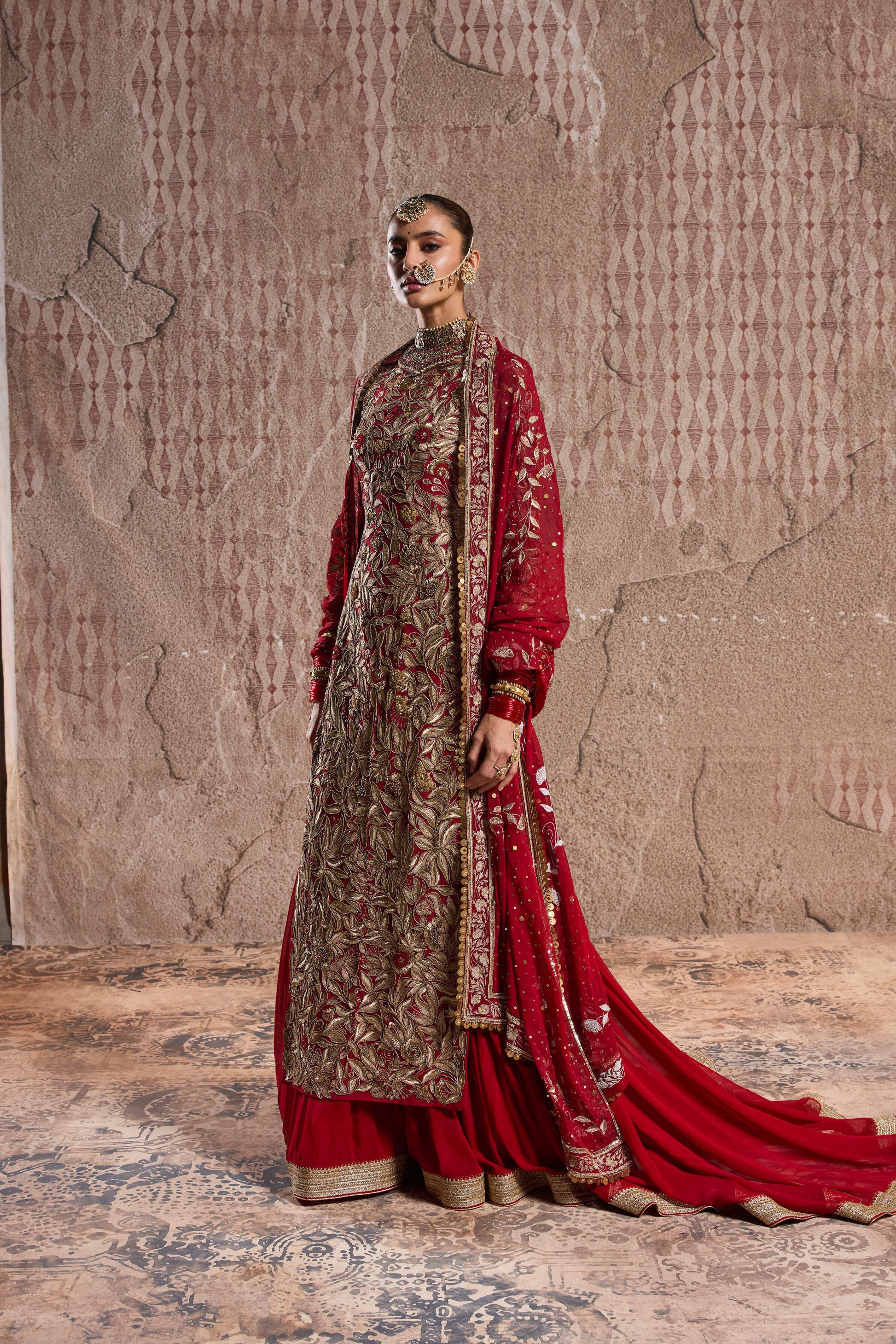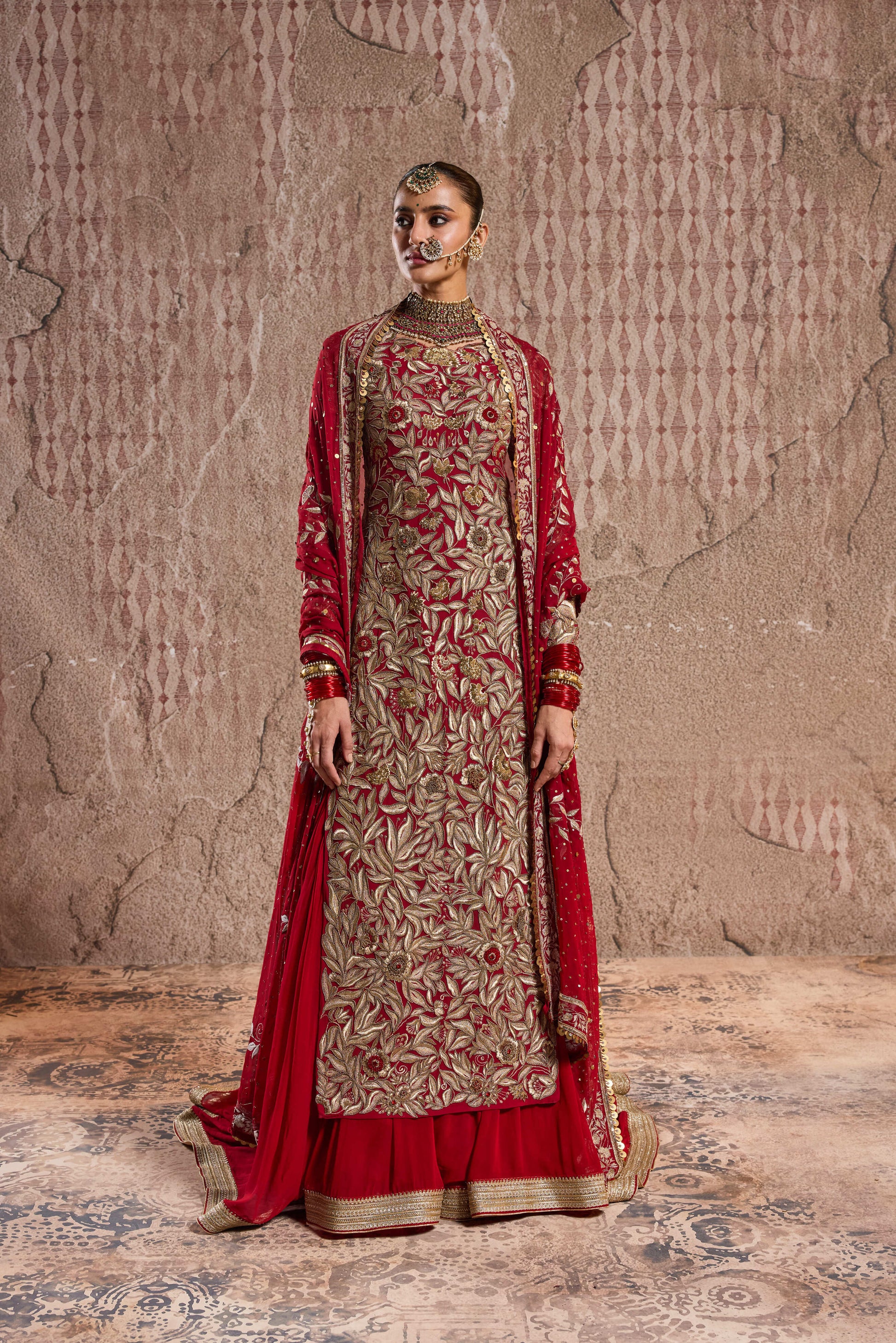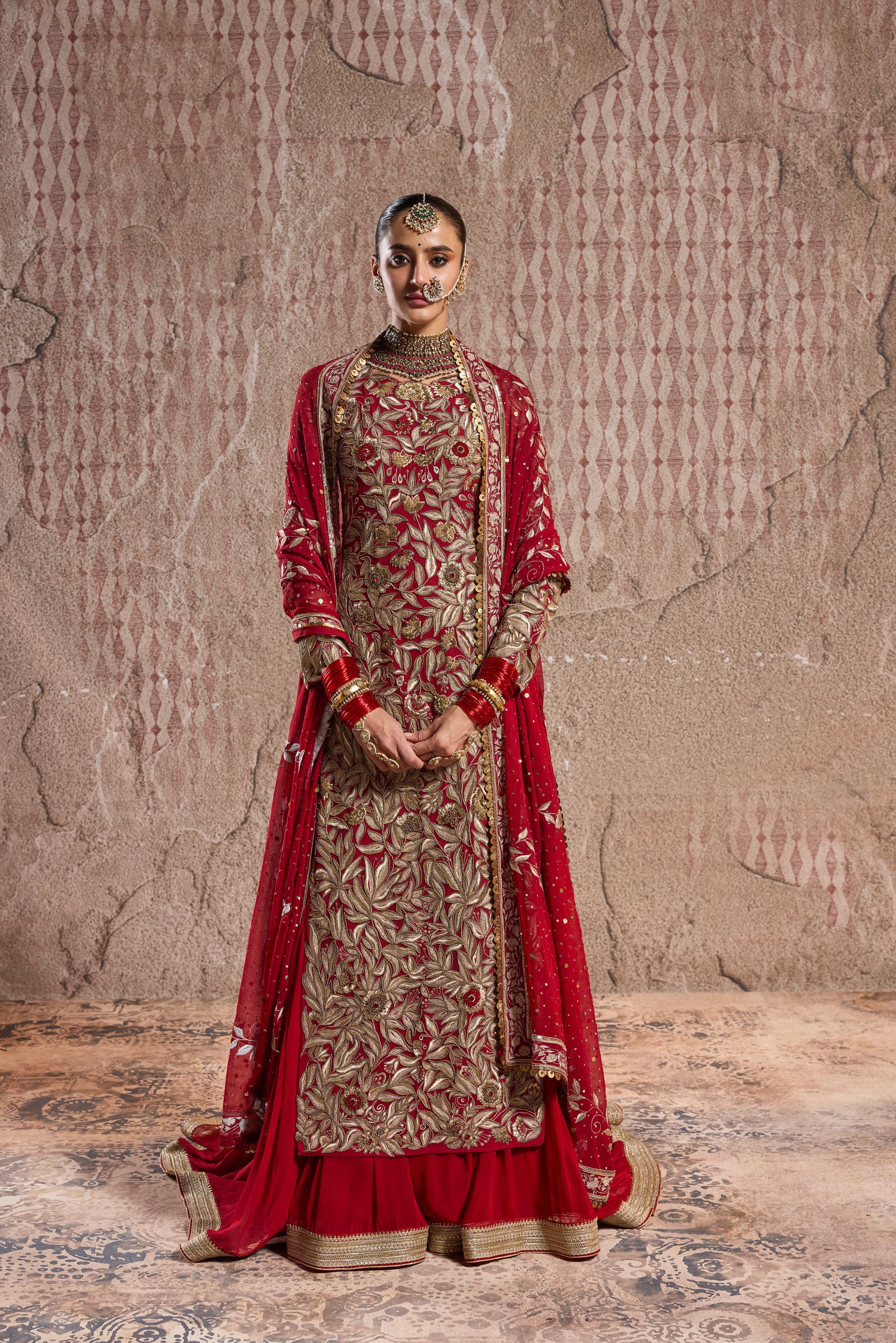 Crafted from pure crepe, this red long suit features a stunning mix of machine and hand embroidery, showcasing intricate detailing. Paired with a luxurious sharara for dramatic flair and a handcrafted heavy dupatta, it’s a perfect blend of elegance and craftsmanship for the modern woman.
