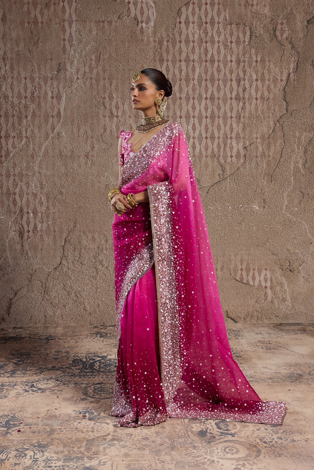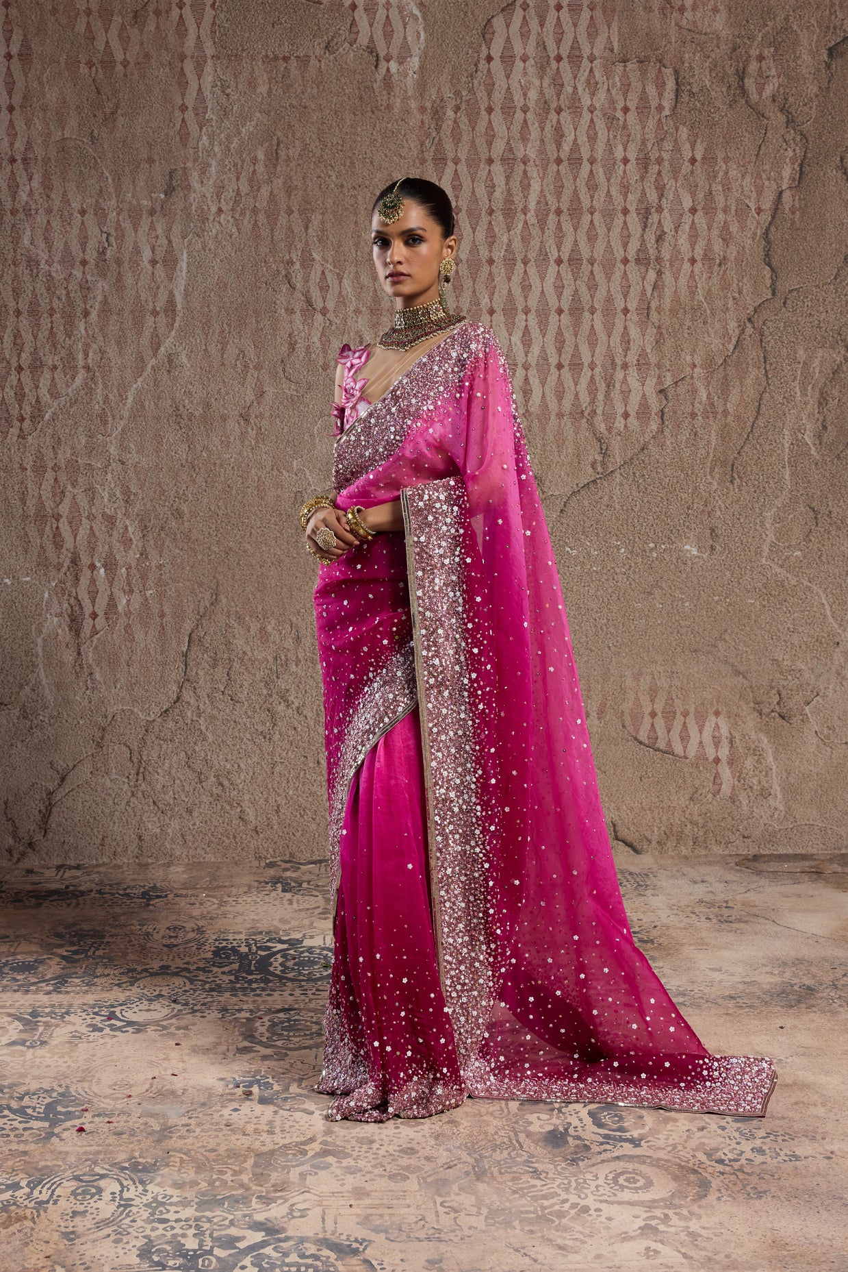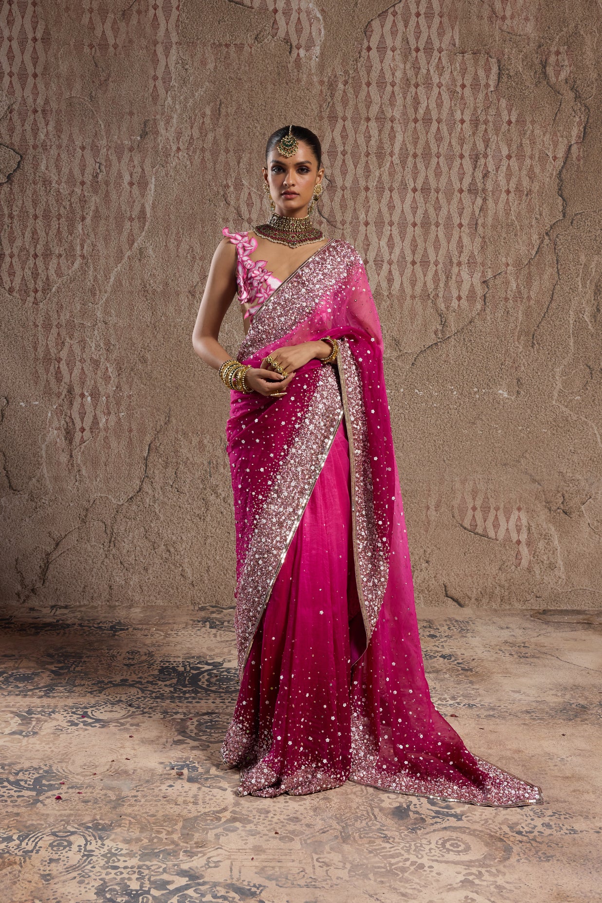 OMBRE PINK GRADIENT SAREE WITH ORNATE BORDERS AND 3D FLORAL BLOUSE