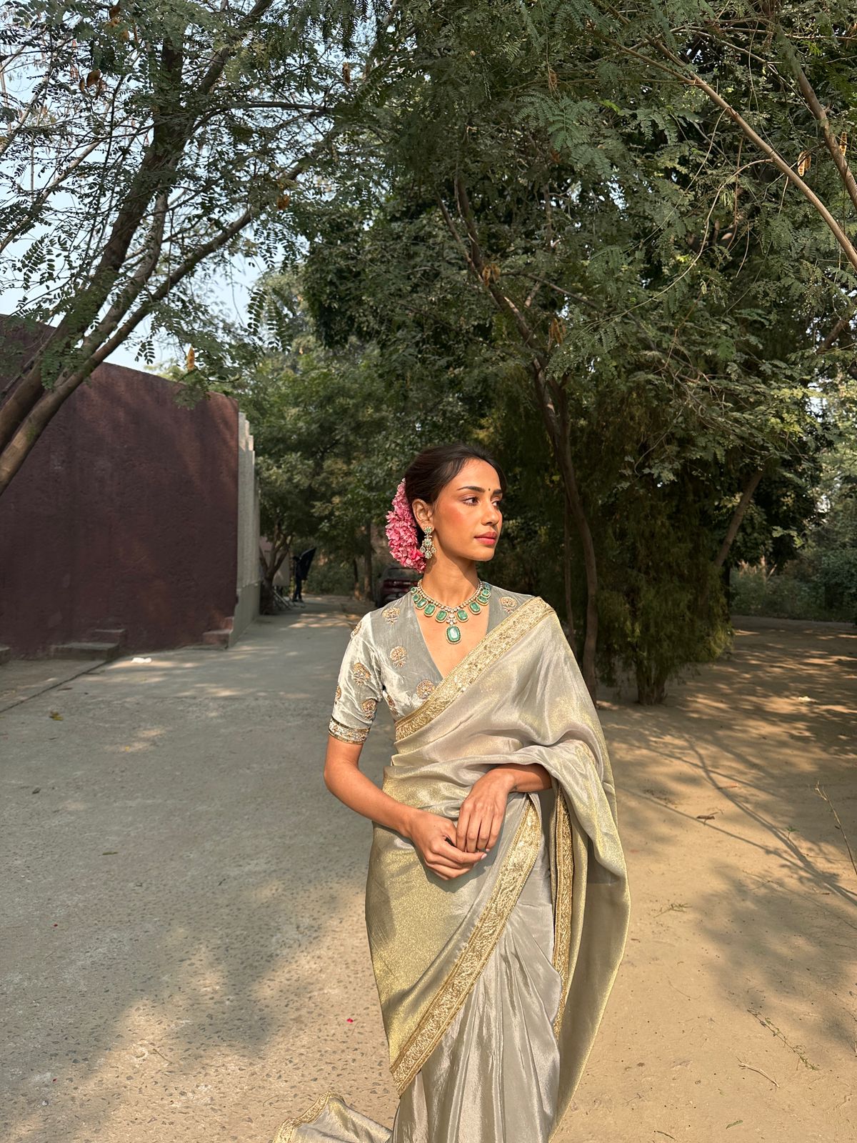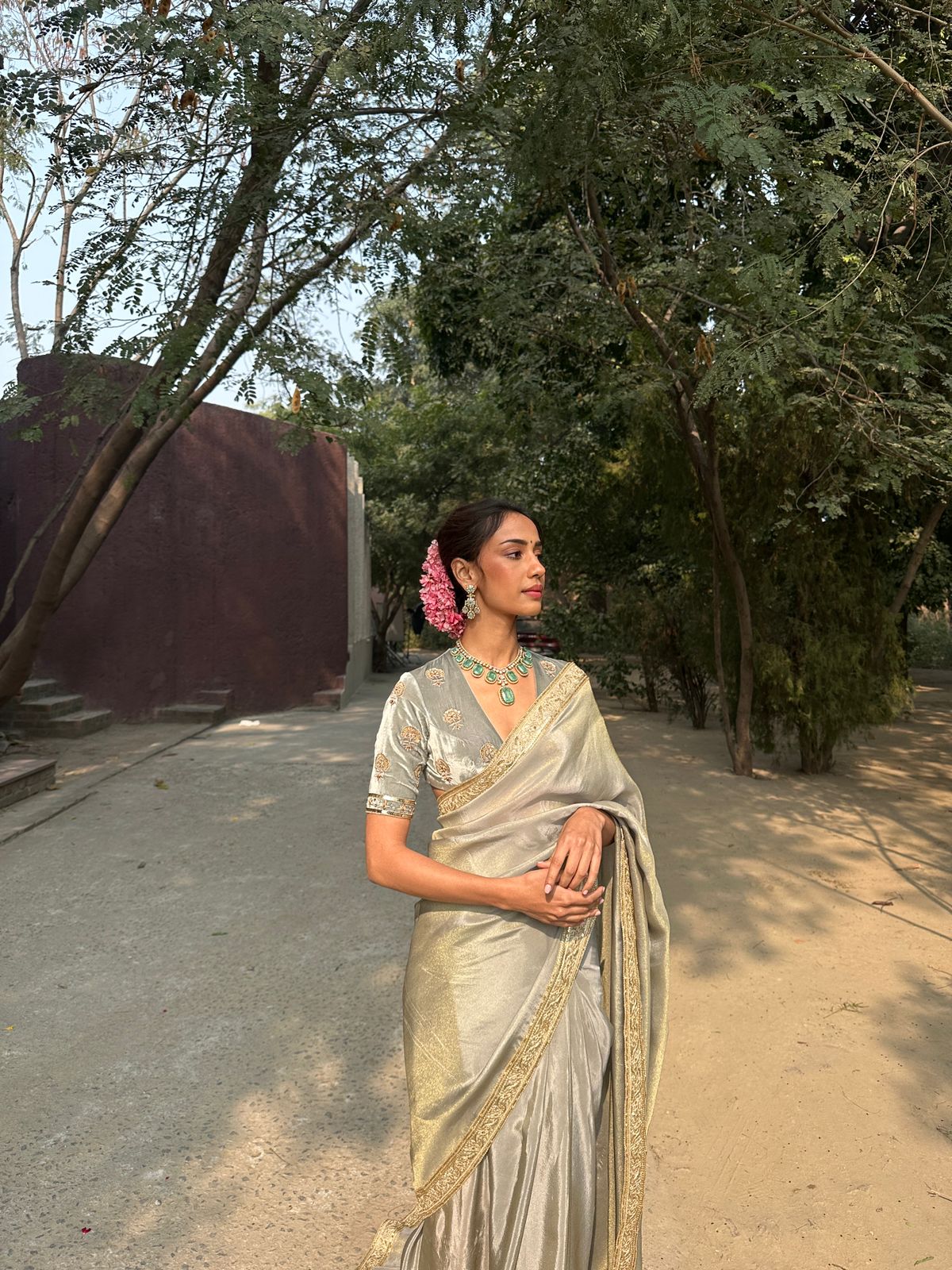 Paired with a pure velvet blouse in a classic cut, adorned with meticulous handwork in traditional motifs, this ensemble pays homage to heritage craftsmanship. The blouse features detailed embroidery that captures light with every movement, making it ideal for both day celebrations and evening soirées.
