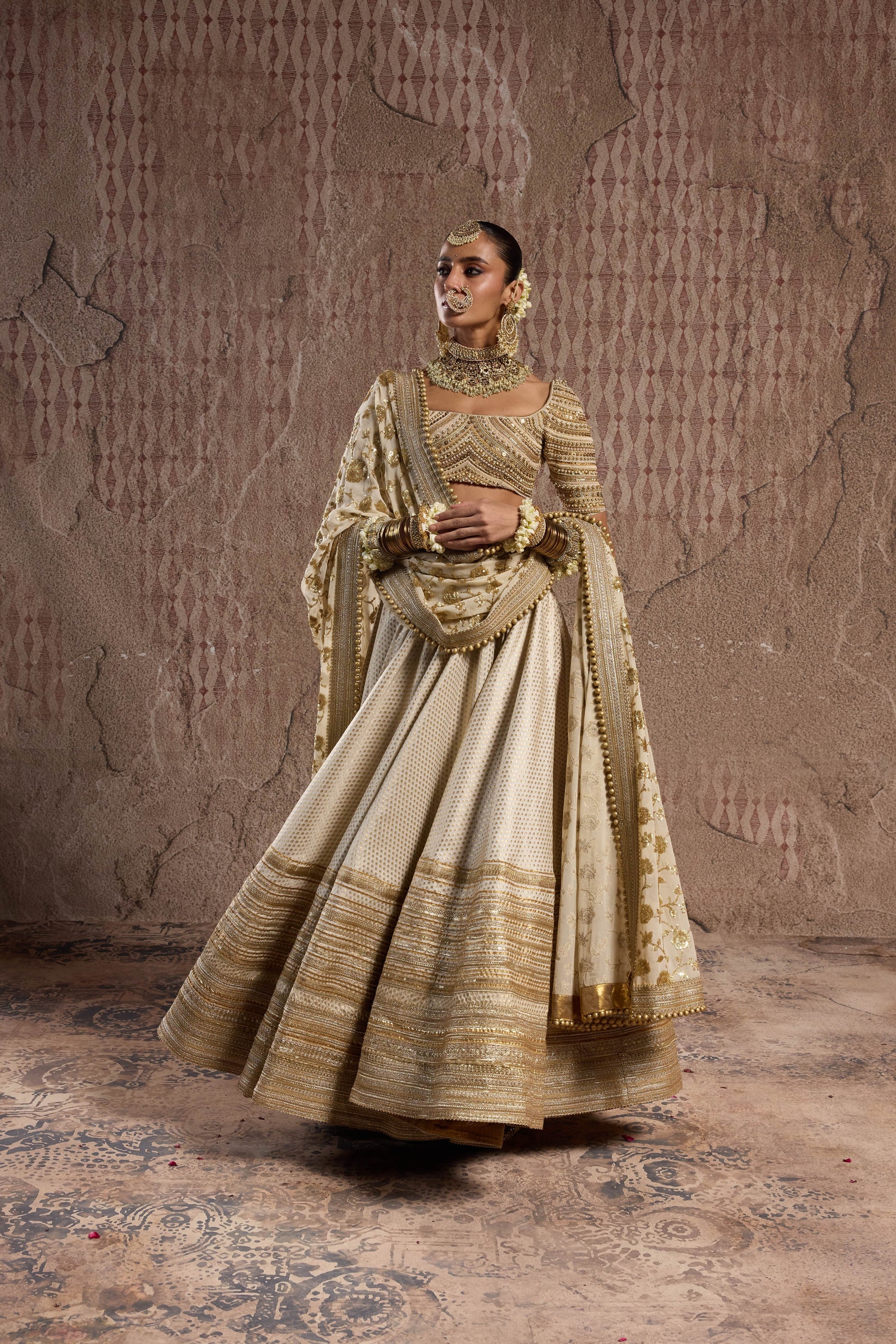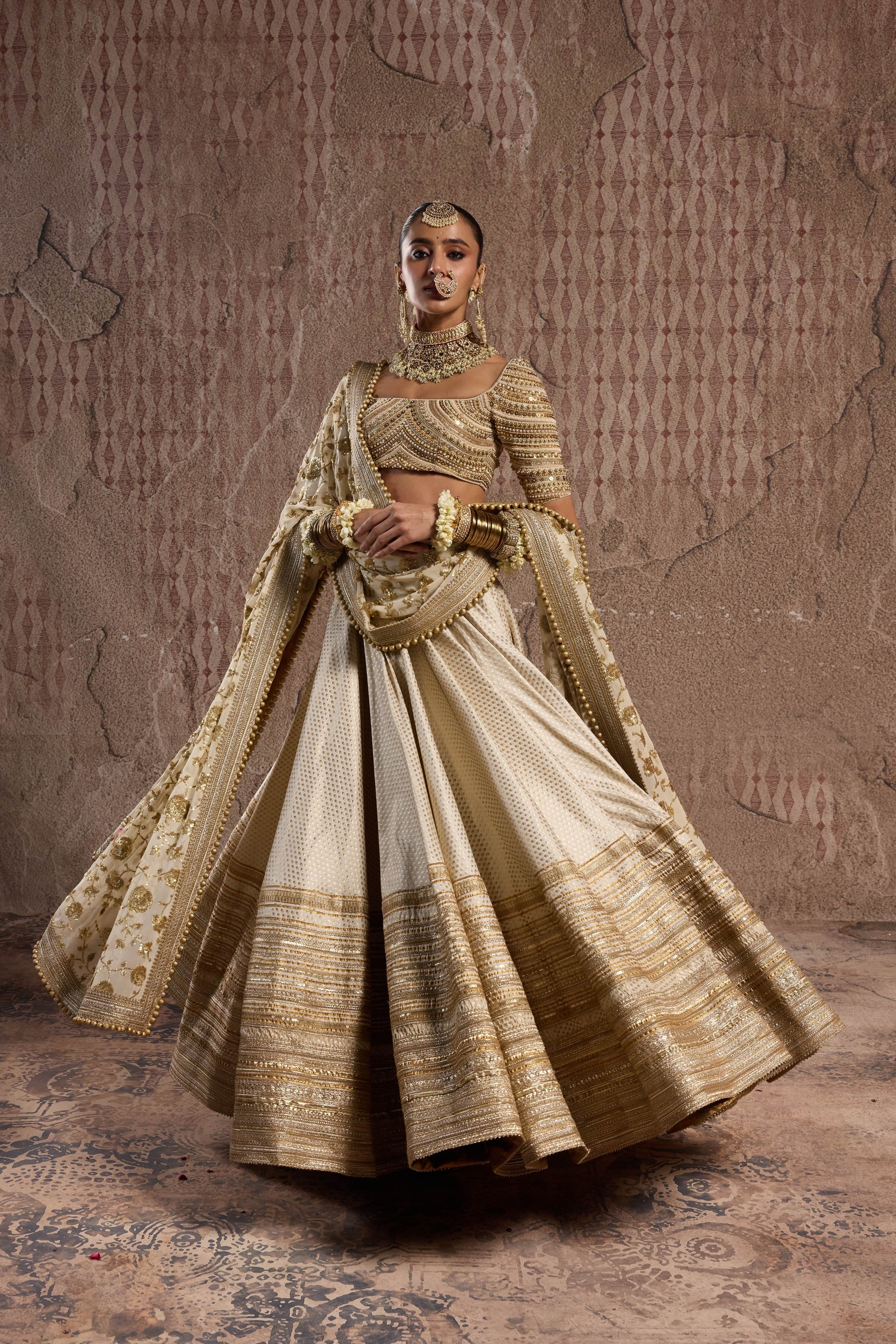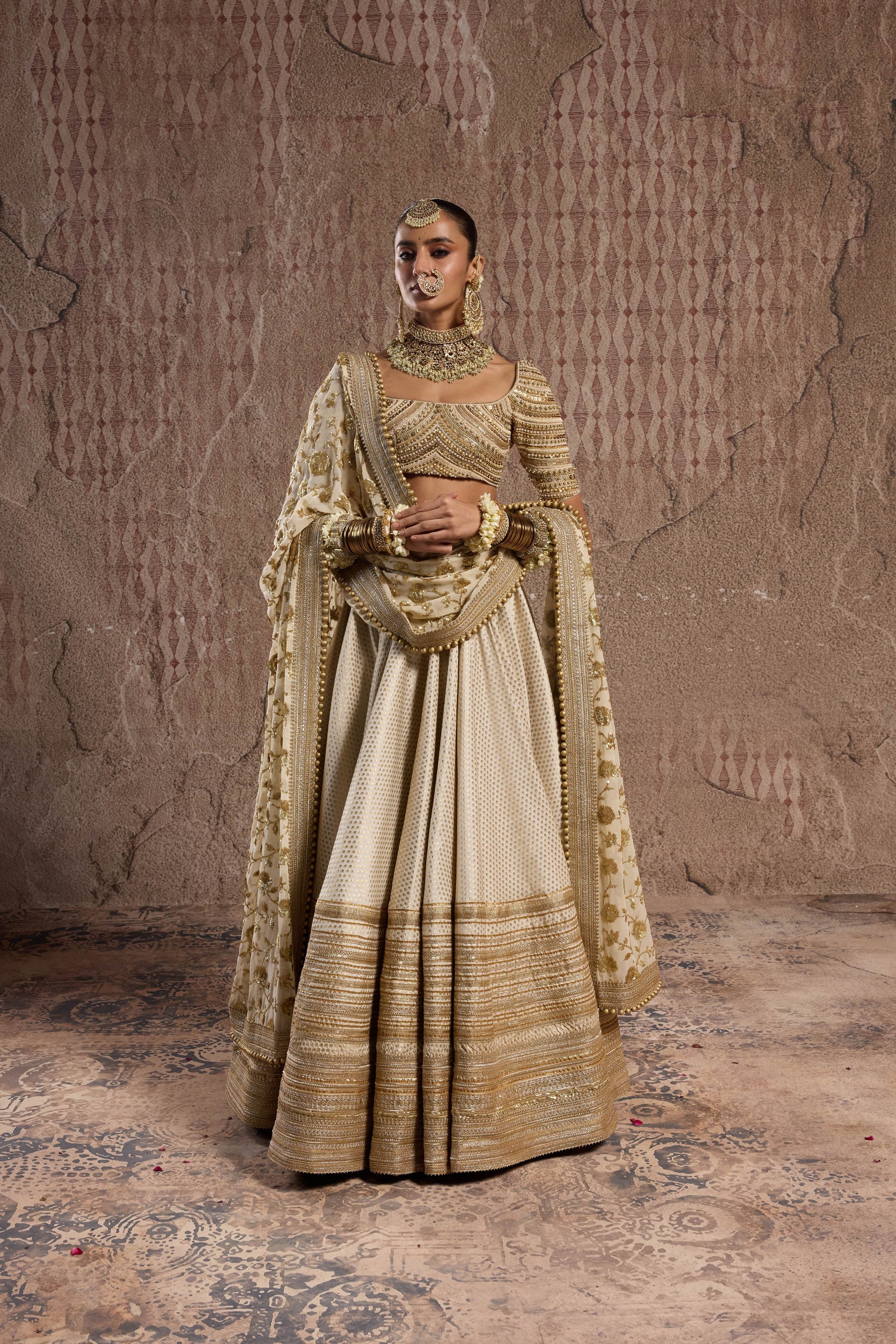 Indulge in the grandeur of this ivory lehenga with exquisite detailing throughout. The lehenga boasts a voluminous flair, complemented by intricate borders at the bottom. The blouse features stunning craftsmanship with detailed work, while the dupatta dazzles with sequins and a bordered edge, adding an extra touch of sparkle and elegance to this luxurious ensemble.