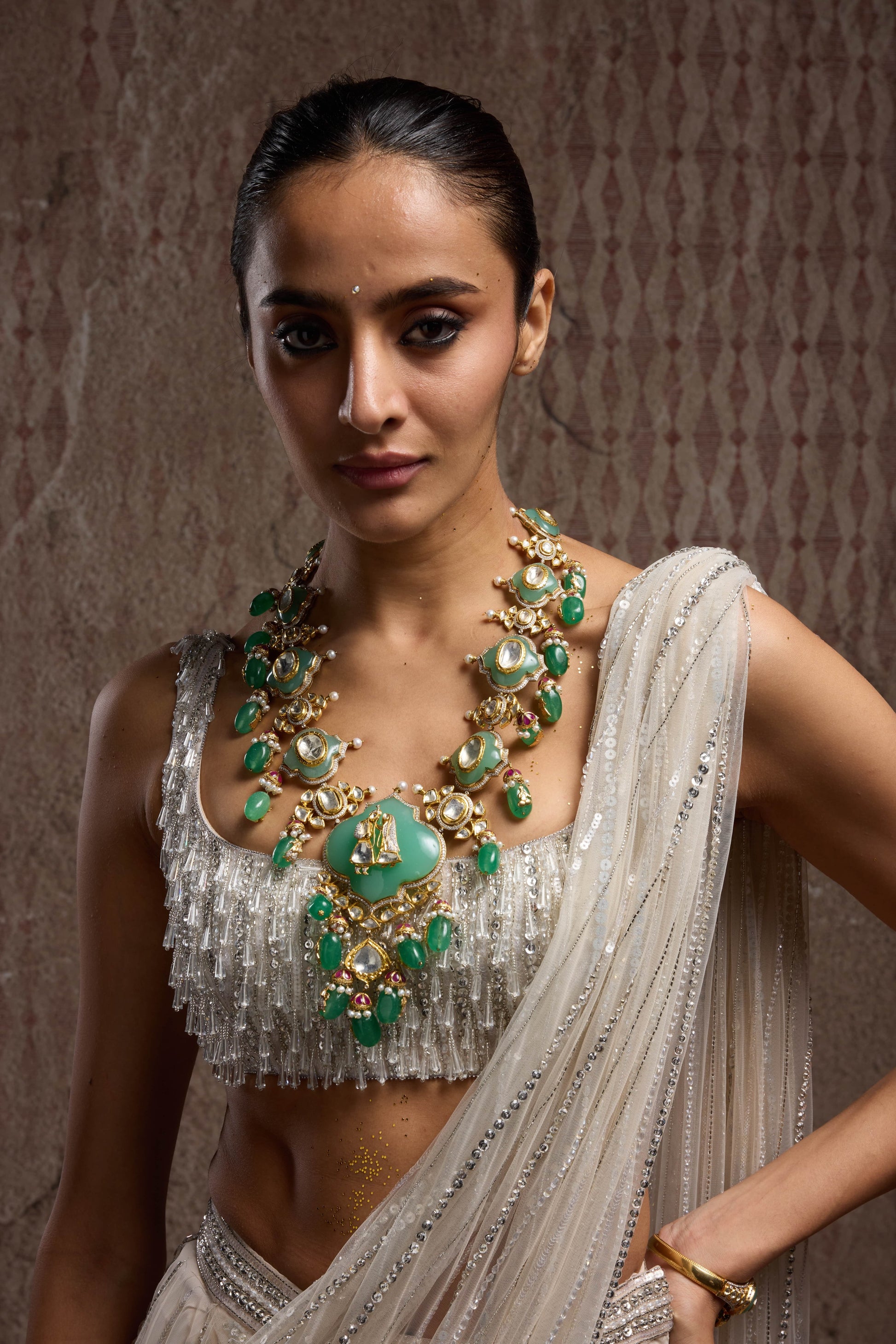 Exude confidence and allure in this pastel dull beige pre-drape saree, featuring sleek, creatively sexy work that enhances its contemporary charm. The blouse, designed with tessels all over, adds a playful yet sensual touch. With its flattering, demure shape and feathered accents along the bottom and pallu ends, this saree is the perfect fusion of modern elegance and youthful sensuality.